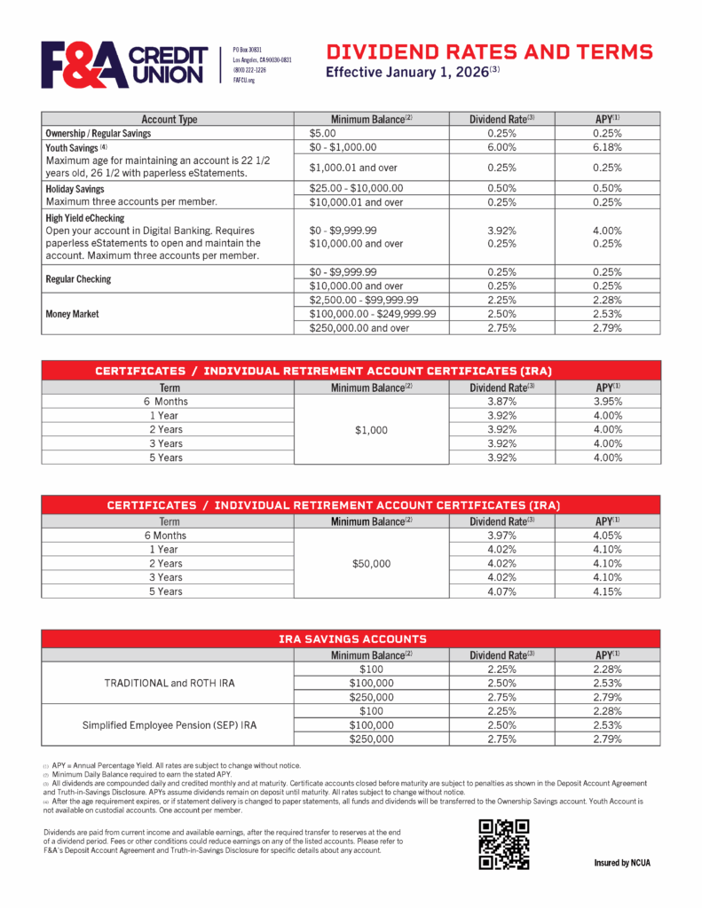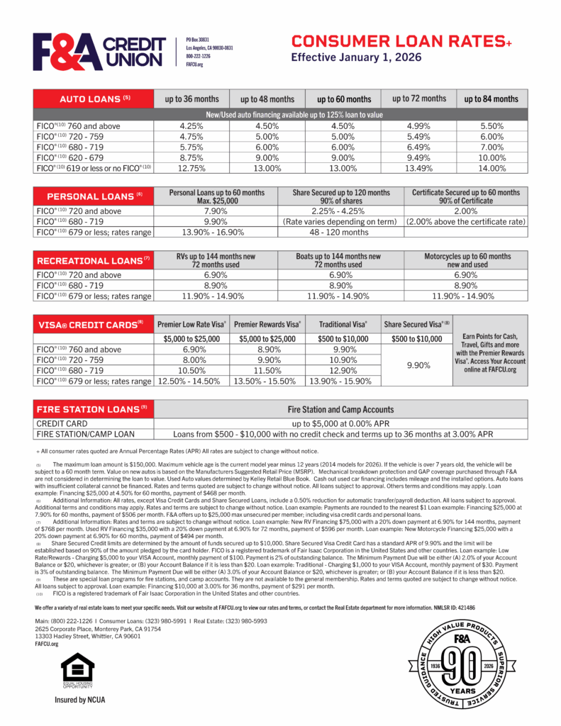Great Rates, No Gimmicks. As a member-owned not-for-profit cooperative, F&A Credit Union helps our members maximize financial success with higher dividends on savings and lower rates on loans, making every dollar count